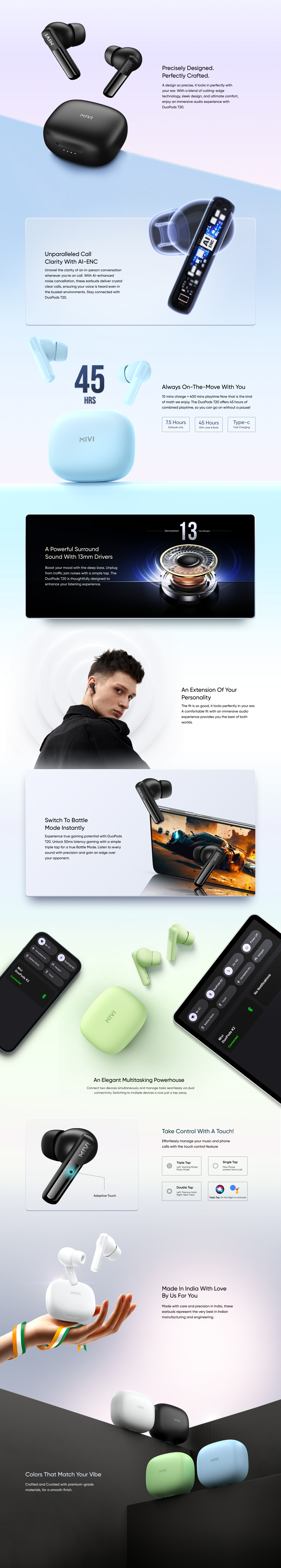 Introducing DuoPods T20: the pocket-sized audio powerhouse engineered with AI-ENC for crystal-clear HD calls.
